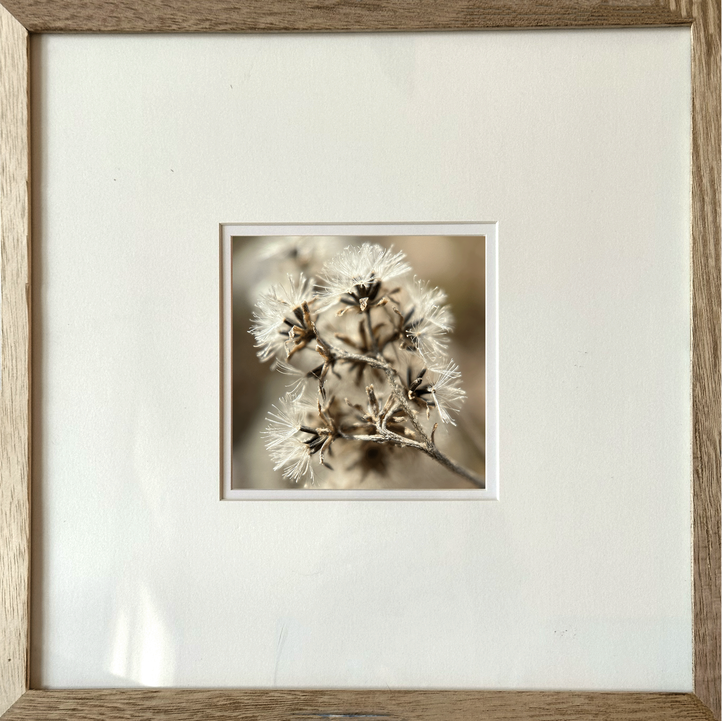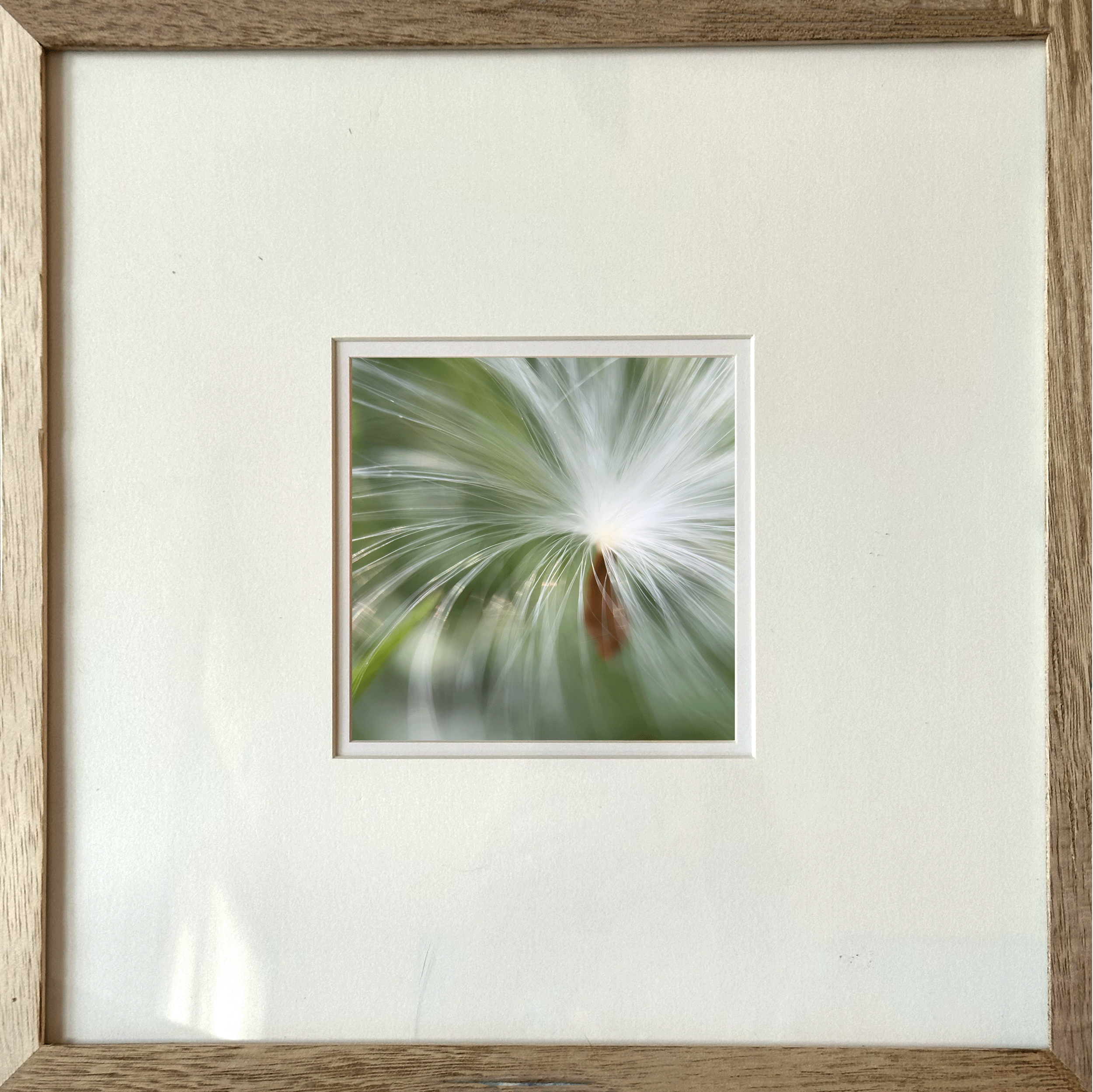 Detail of Angelic Milk Weed ~ 5x5 archival print of the shifting consciousness within the seed of a milkweed as it prepares its flight. Framed with a double matt and natural wood; 12”x12”.